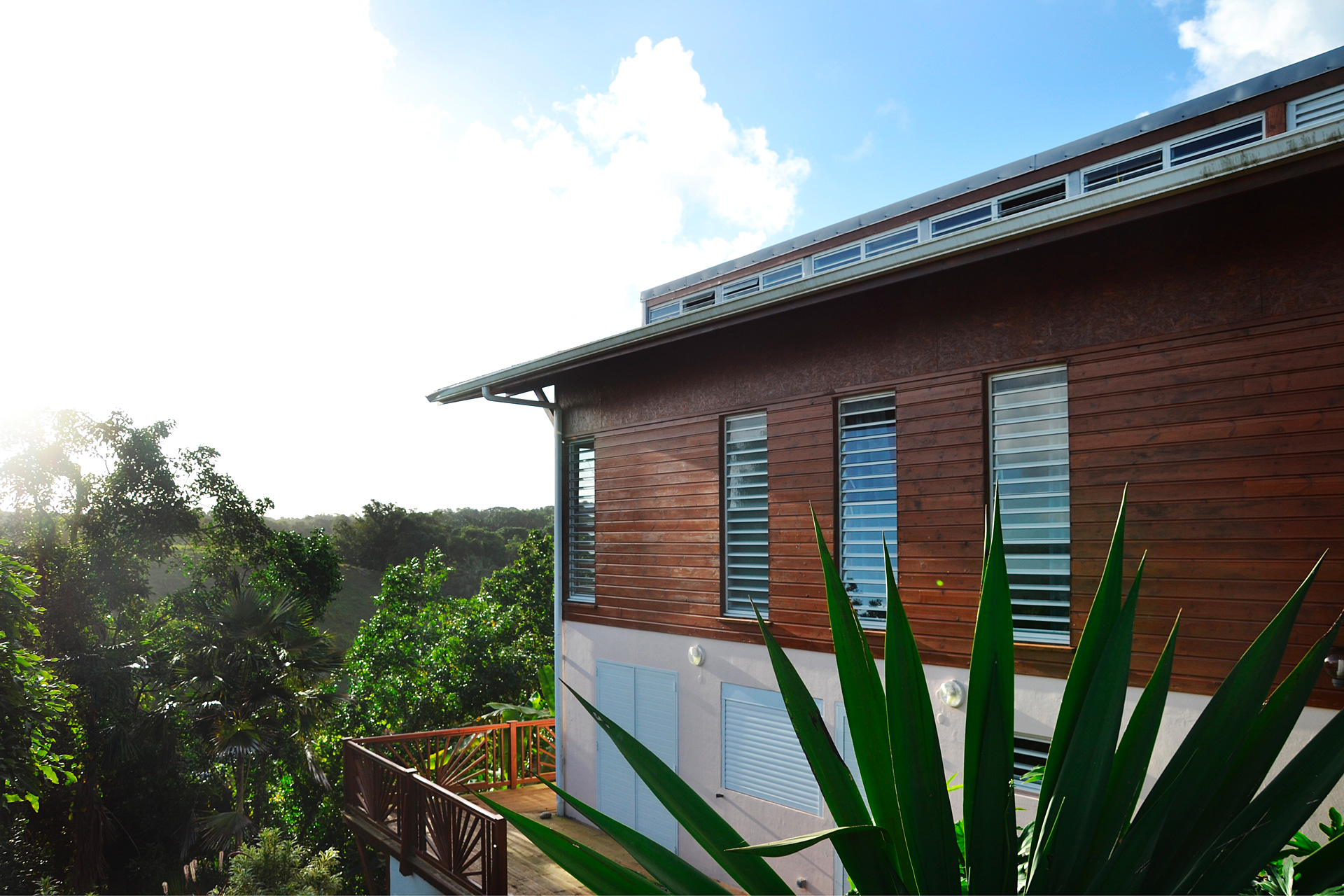 Construction d’une maison individuelle contemporaine guadeloupéenne. En s’inspirant des cases antillaises avec sa structure en bois apparente, et sa galerie réinterprétée, l’arrière de la maison s’ouvre sur l’extérieur pour laisser rentrer la nature et la lumière. Située en haut d’un morne, la maison est à la fois perméable aux vents dominants, tout en devant être réfléchie pour résister aux vents extrêmes en période de cyclone.