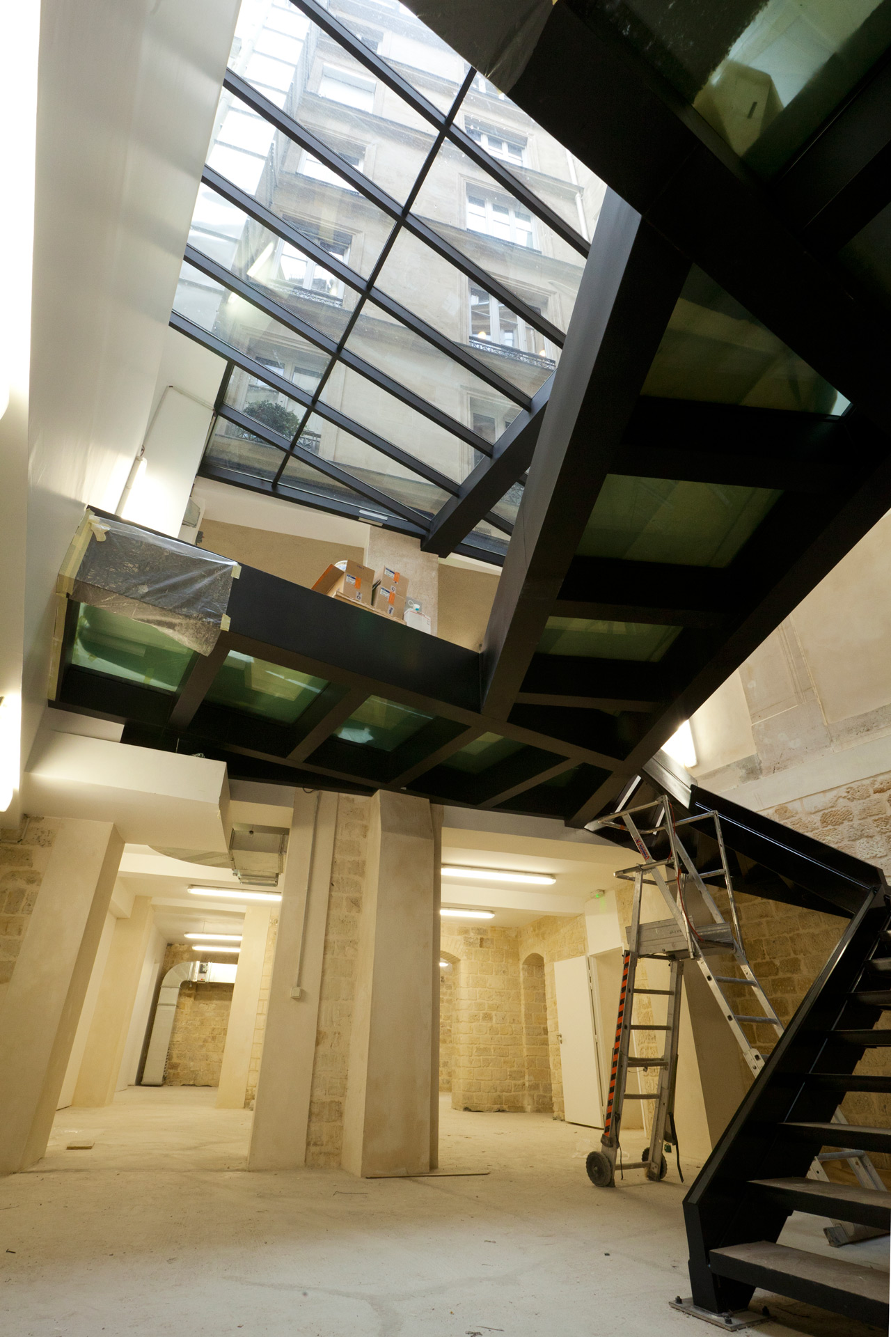 La création d’un seul espace commercial qui se développe sur deux étages, avec une reflexion de l’arrivée de lumière naturelle au sous-sol. Entre les deux corps de bâtiment, la cour intérieure est couverte par une verrière, permettant d’apporter la lumière naturelle jusqu’au niveau -1 du local commercial. Avec la particularité du projet d’être dans un immeuble Haussmannien, à usage mixte en site occupé.